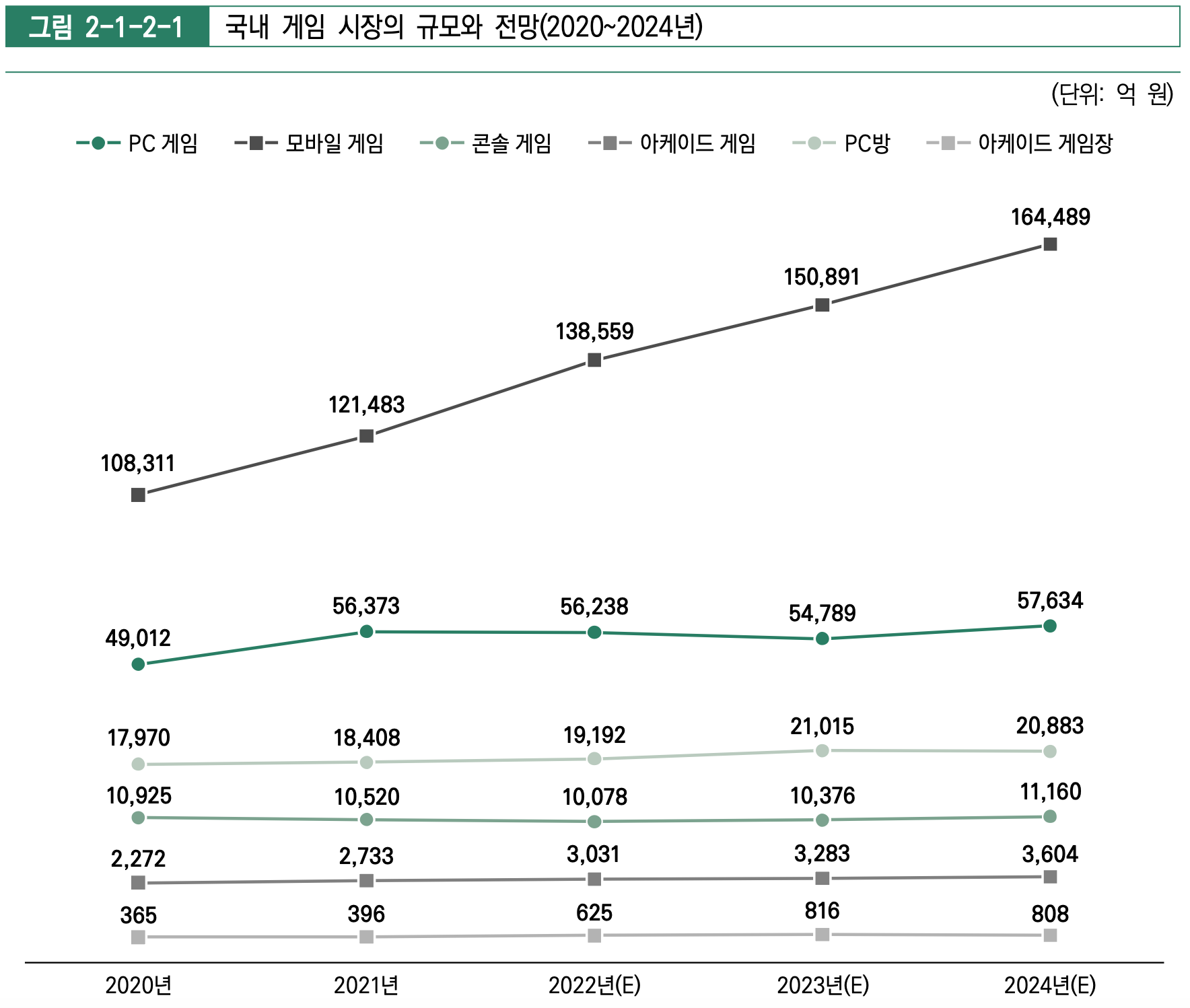 출처: 한국콘텐츠진흥원 '2022 게임백서' 마지막으로 국내 게임 시장의 규모와 전망은 2024년에 25조 8,578억 원을 예상하고 있는데요. 모바일 게임만 지속해서 성장할 것이라고 전망하고 있습니다.