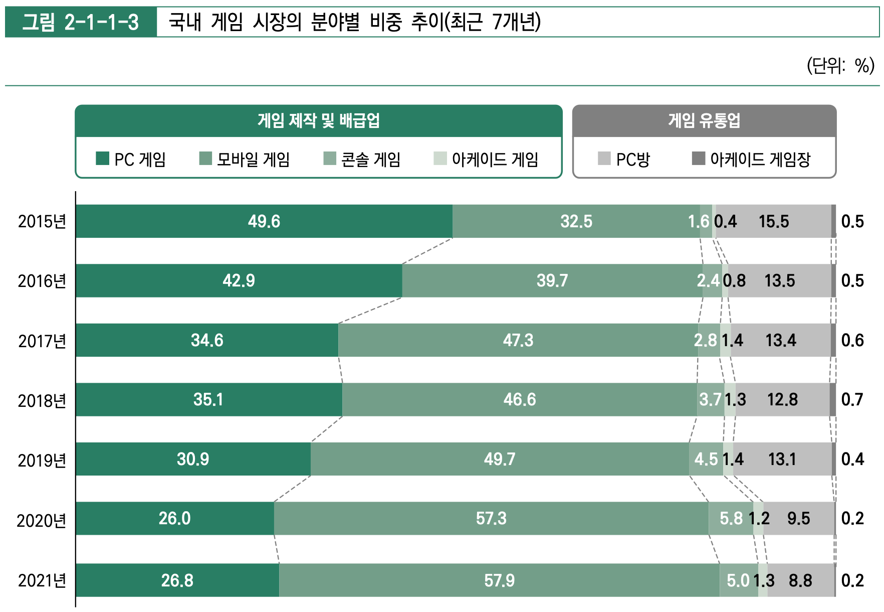출처: 한국콘텐츠진흥원 '2022 게임백서' 분야별로 나눠서 본다면 콘솔 게임을 제외하면 모든 분야가 2020년에 비해 성장했는데요. 단순 증감률만 봤을 때는 아케이드 게임이 가장 높은 성장을 기록했습니다. 또한, PC게임과 모바일게임은 국내 게임 시장에서 점유율을 높아졌으며 반대로 콘솔 게임과 PC방은 하락했습니다.