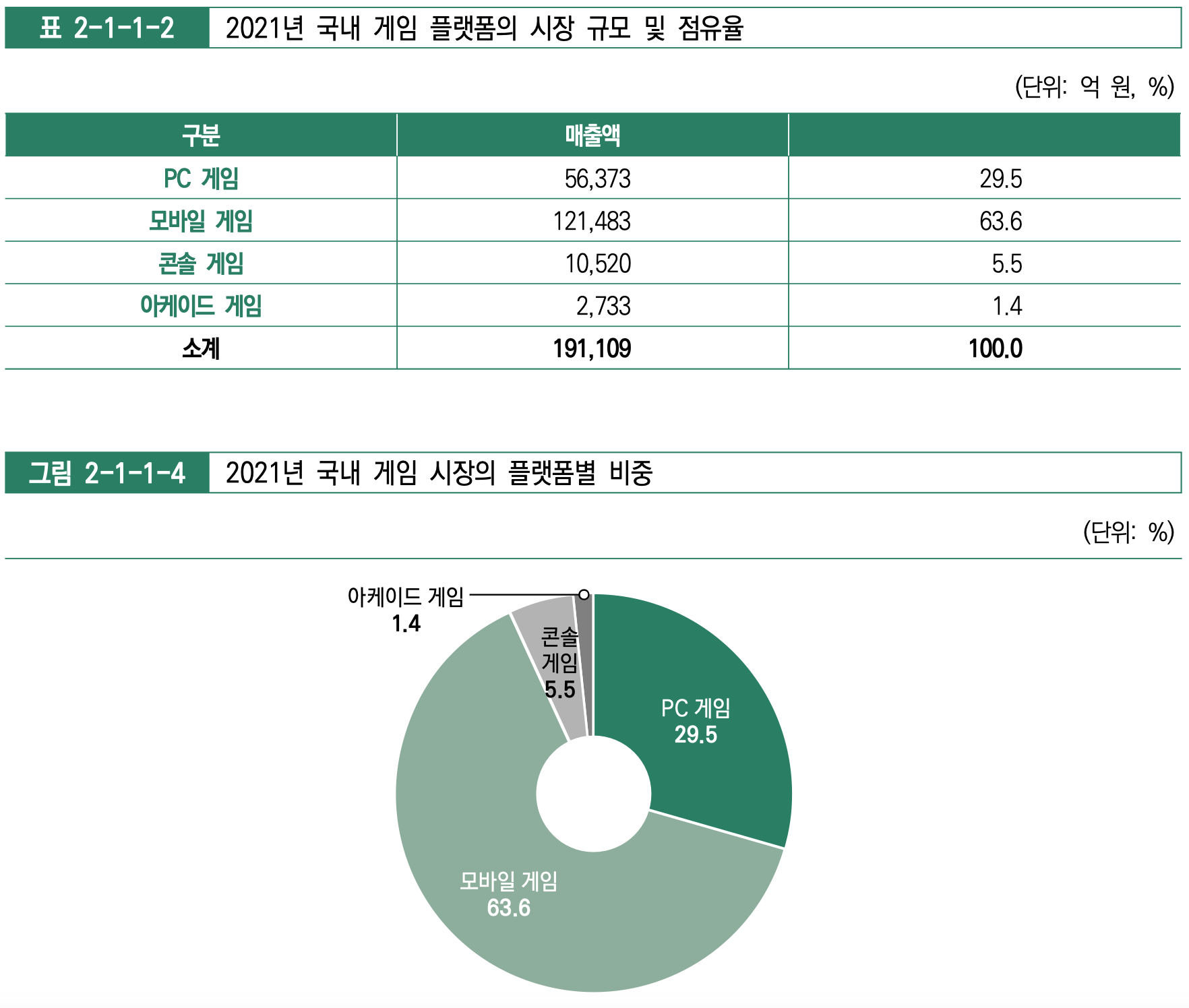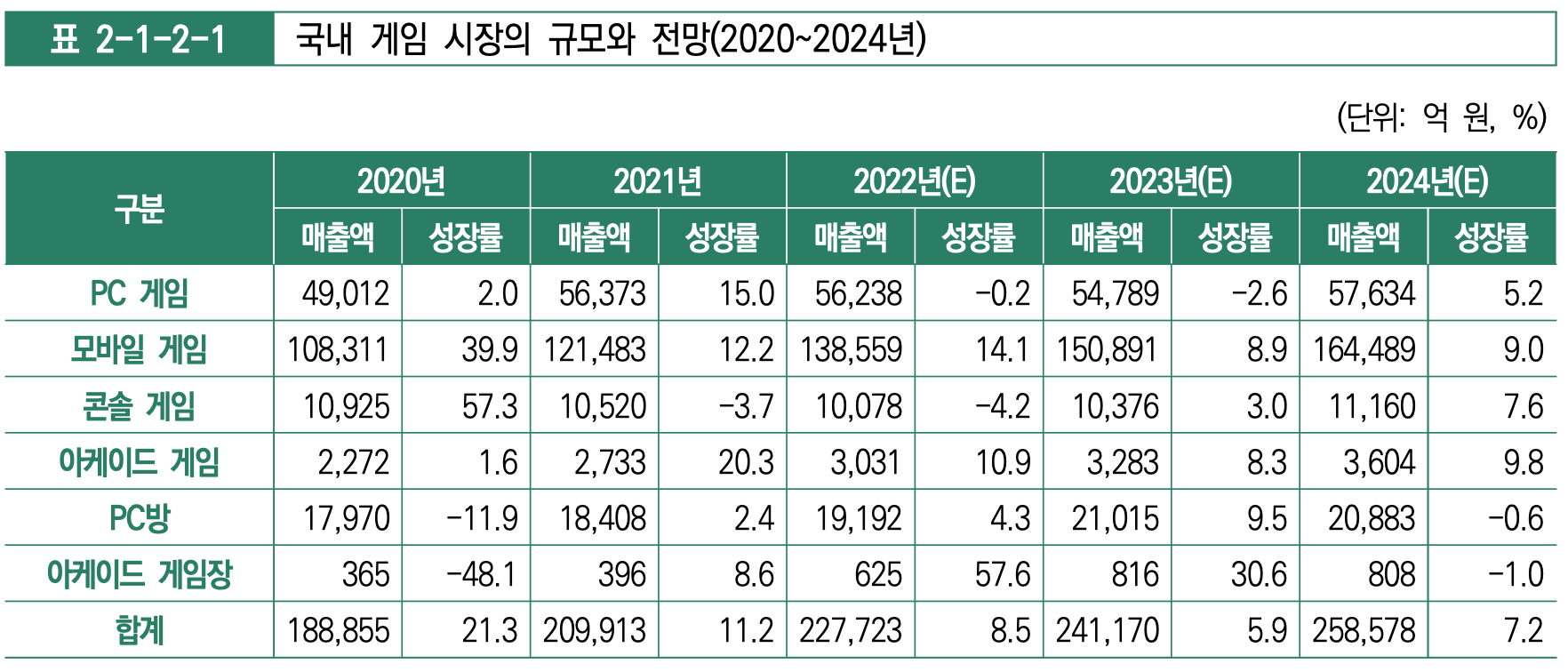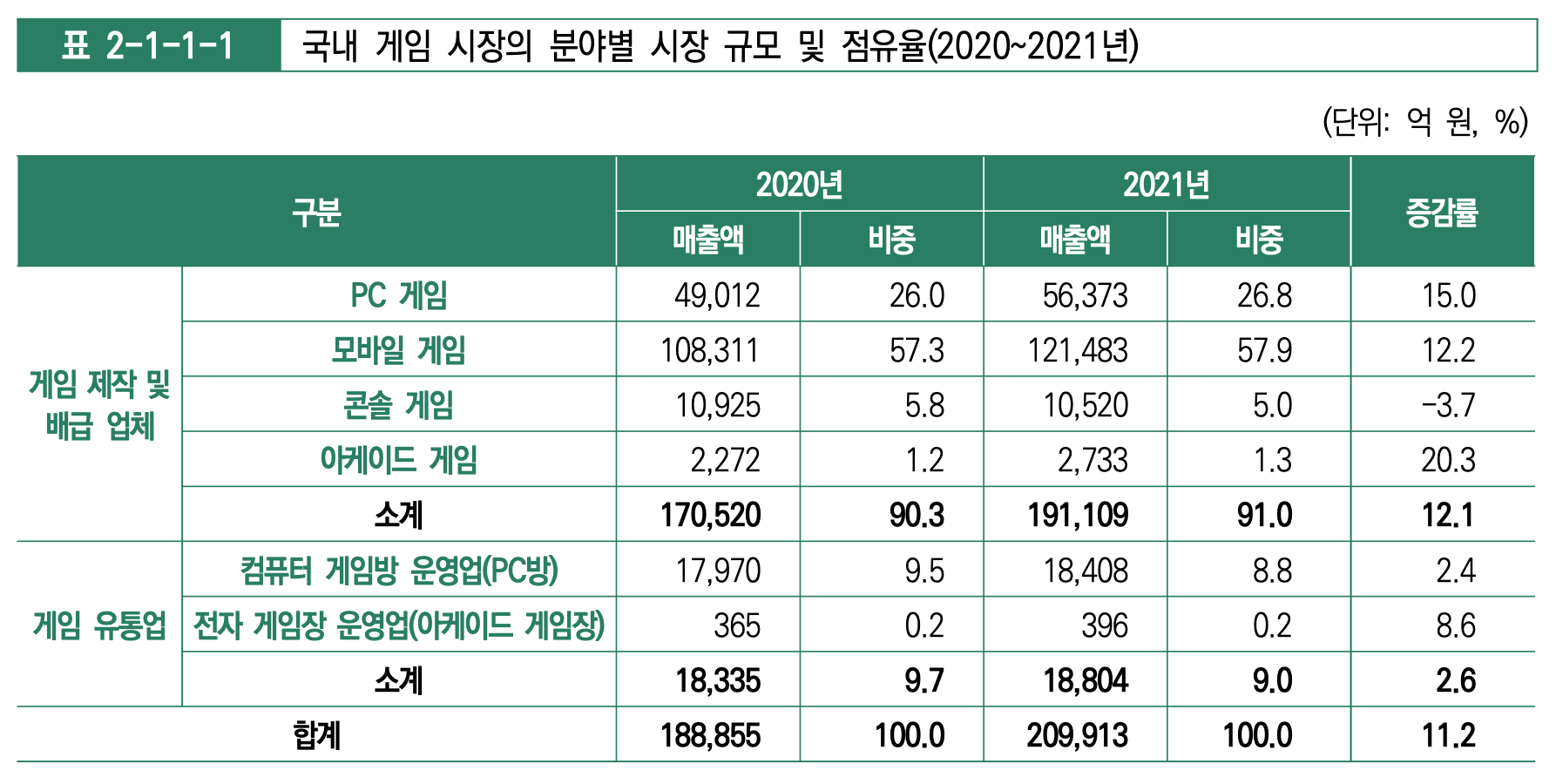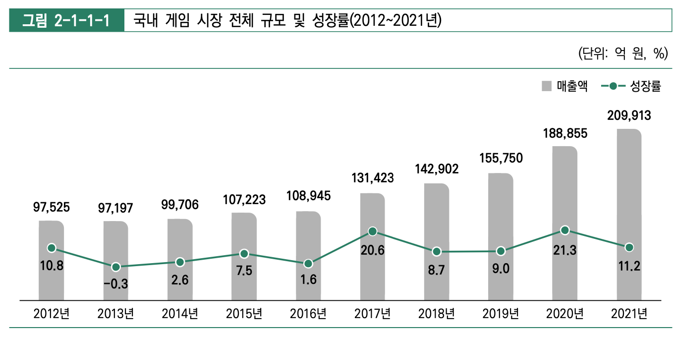 출처: 한국콘텐츠진흥원 '2022 게임백서' 2021년 국내 게임 시장 전체 규모는 20조 9,913억 원으로 18조 8,855억 원 기록했던 2020년에 비해서 11.2% 성장했습니다. 이는 21.3% 성장했던 2020년에 비해서는 낮은 수치를 기록했습니다. 그래도 -0.3% 성장을 기록했던 2013년 이후에 국내 게임 시장 규모는 지금까지 계속 성장했습니다.