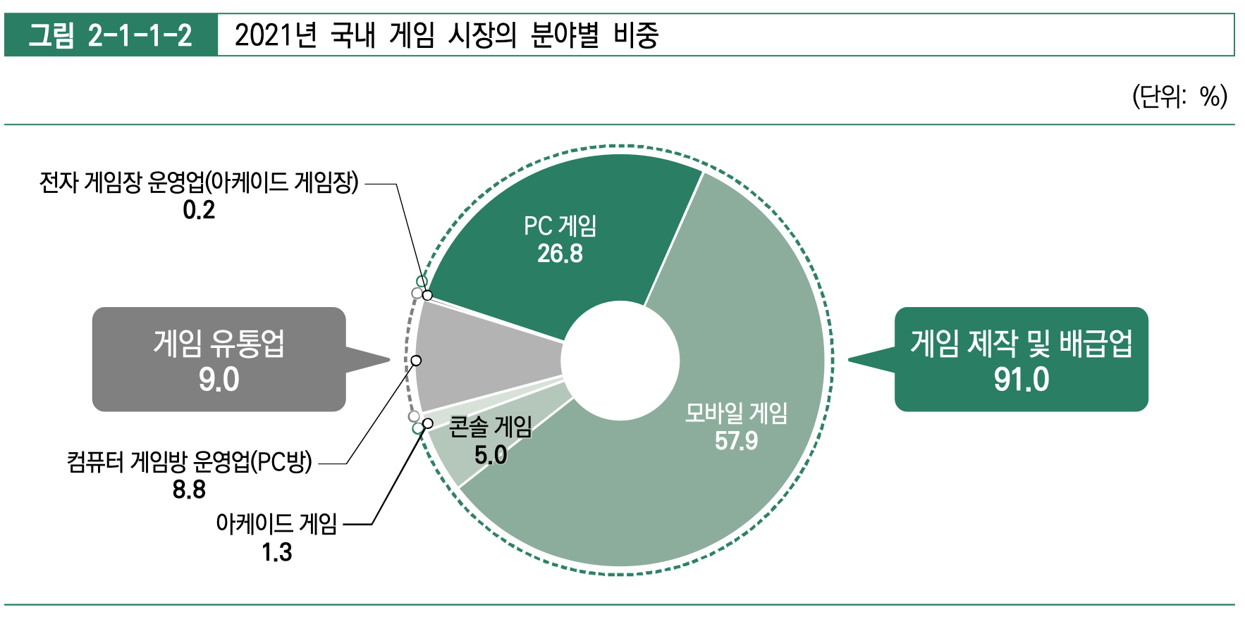출처: 한국콘텐츠진흥원 '2022 게임백서' 게임 제작 및 배급업이 전체 국내 게임 시장에서의 91%를 차지하고 있는데요. 그중에서 모바일 게임이 57.9%로 계속 가장 높은 점유율을 기록하고 있습니다.
