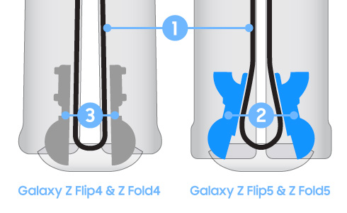 출처: 삼성공식홈페이지 플렉스 윈도우 말고 눈에 들어온 것은 플렉스 힌지인데요. 이번 갤럭시 Z 플립5 경우에는 접었을 때 공간이 남아있었던 이전과 다르게 완벽하게 접히는 모습을 보여줬습니다. 이번 플렉스 힌지는 이전 플립과 다르게 접혔을 때 물방울 모양으로 접히는 것이 특징인데요. 이것을 통해 틈새를 최소화할 수 있었지만, 섬상 공식 웹사이트를 보니까 접힘 자국이 더 넓게 보일 수 있다고 합니다.