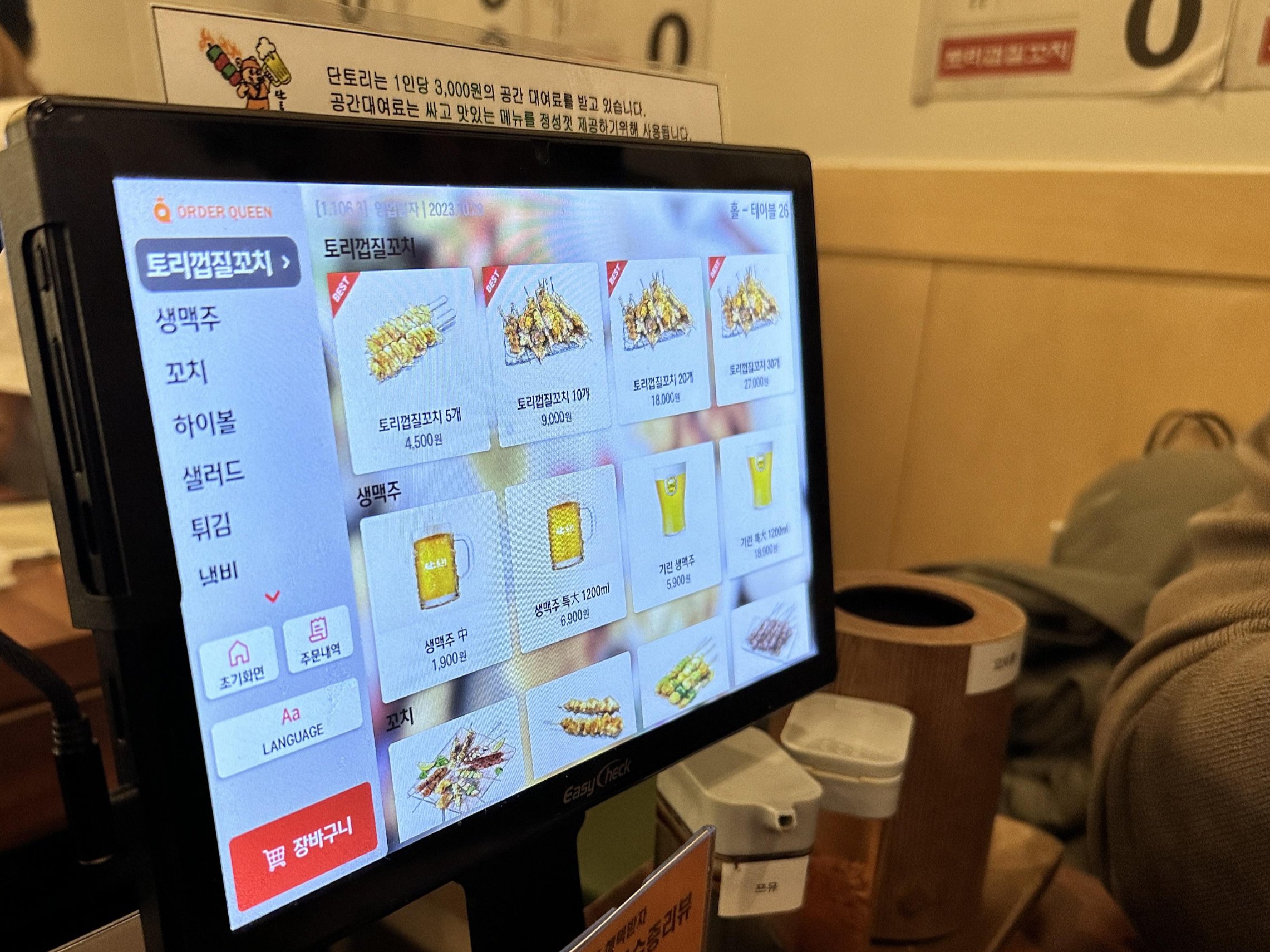 여기는 신기하게 자릿세를 받고 있는데요. 나중에 계산할 때 한 사람당 3,000원이 추가됩니다. 주문은 따로 종업원에게 하지는 않고, 테이블마다 배치된 스크린을 통해 합니다. 나름 가격이 저렴하다고 생각이 드는데요. 개인적으로는 가격이 저렴한 이유가 있는 것 같긴 합니다.