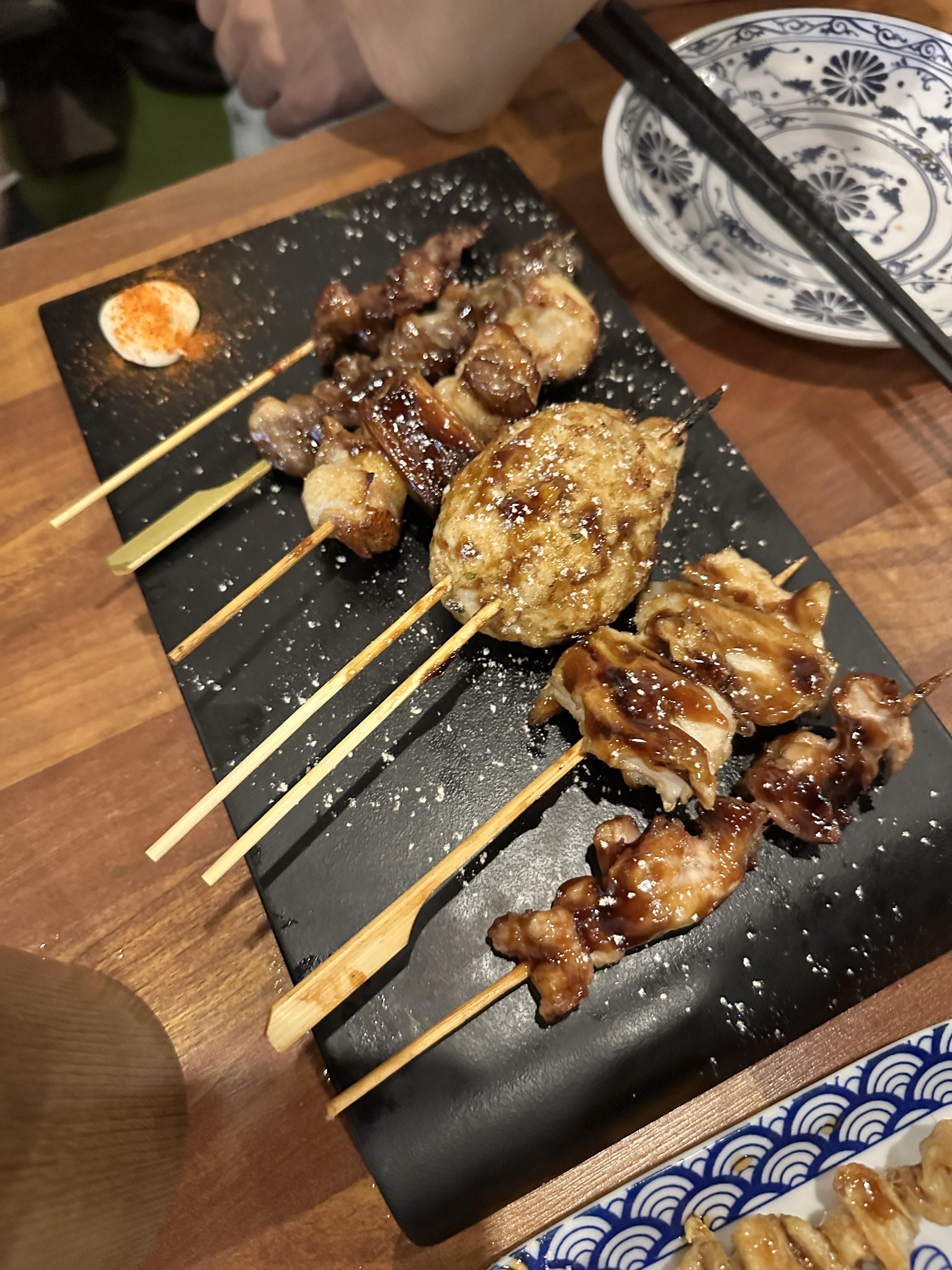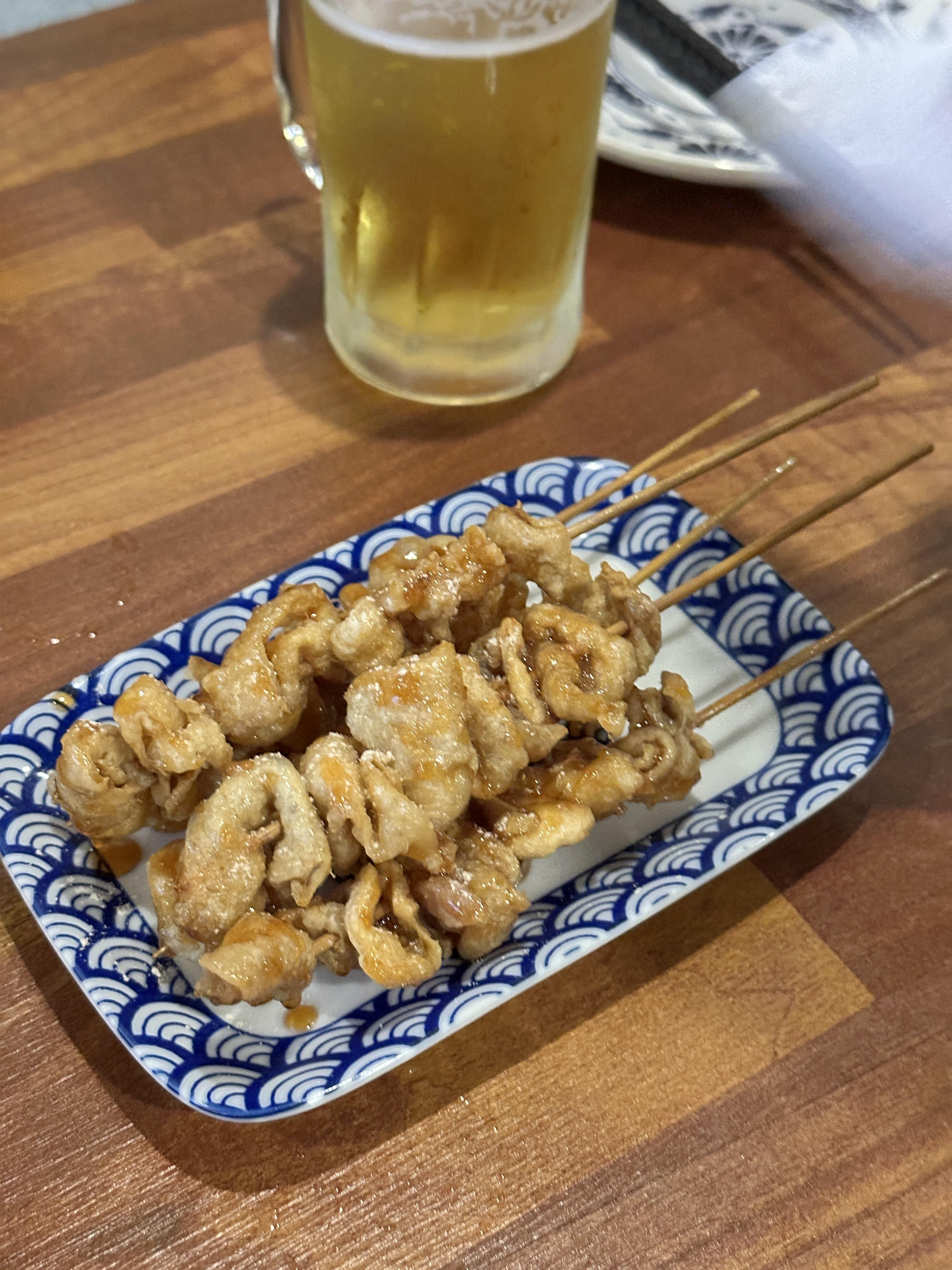 저희는 먼저 안주로 모둠꼬치와 토리껍질꼬치 주문하고, 주류는 하이볼을 시켰는데요. 모둠꼬치는 총 7개로 종류별로 나오는 것 같습니다. 또리껍질꼬치 경우 맛은 그냥 특별히 맛있지는 않았고, 평범했습니다. 하이볼 경우에는 제 기분 탓일 수도 있지만, 다른 하이볼보다는 연하게 나오는 것 같습니다.